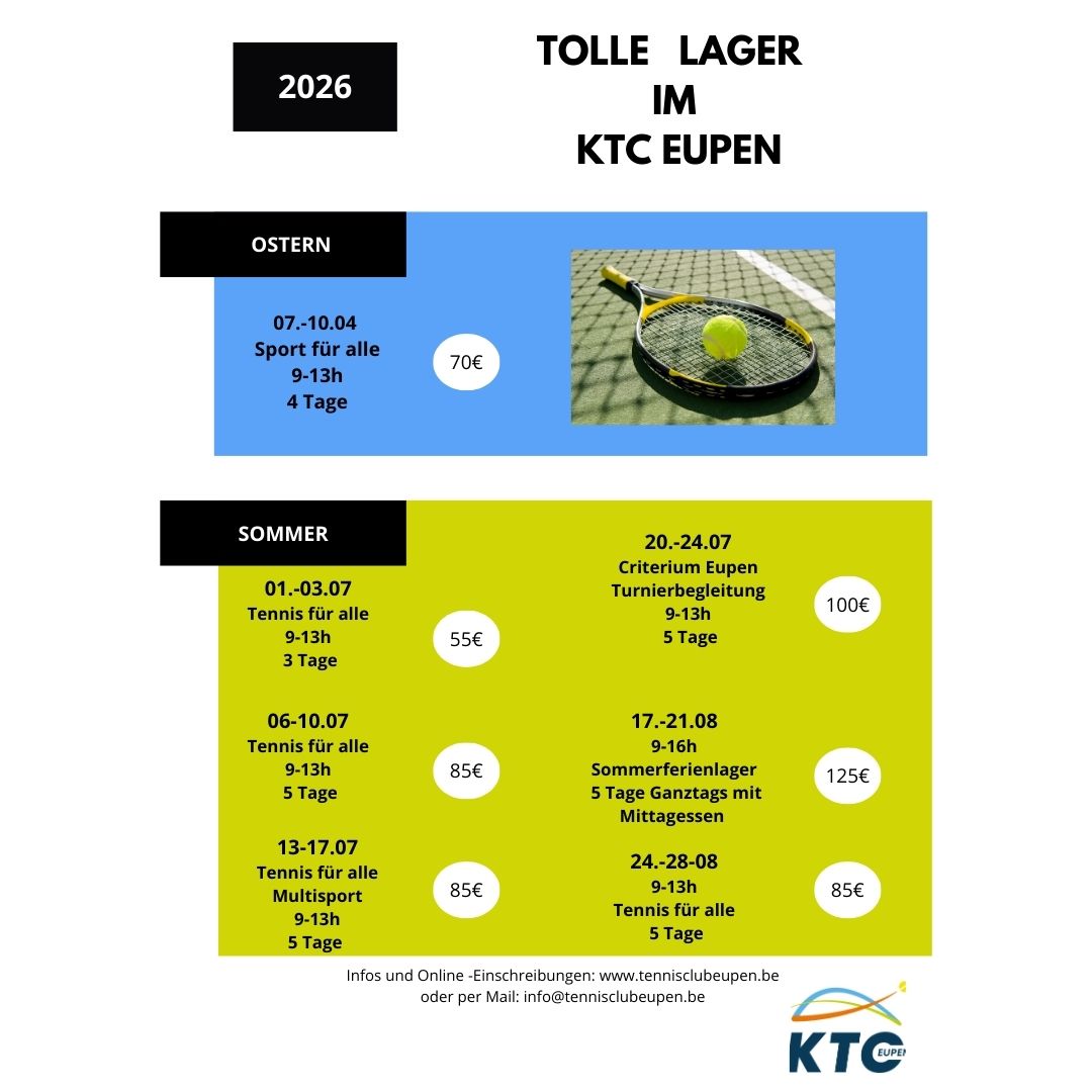 Der Tennisclub bietet im Laufe des Jahres verschiedene Ferienlager und Trainingswochen an. Eine Übersicht über diese Veranstaltungen finden Sie unten. Weitere Informationen und Anmeldeverfahren entnehmen Sie bitte rechtzeitig unseren Neuigkeiten oder fragen Sie im Sekretariat nach.